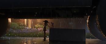 El fotorrealisme dels paisatges (l’aigua, la pluja, la llum) augmenta l’impacte de les emocions (fotorrealisme que van explotar des del primer moment als pòsters promocionals durant l’etapa de producció). El resultat és una escena d’establiment dels personatges contra les forces de la natura, i aquesta contraposició visual genera el realisme emocional. Per mi l’escena d’en Woody i la pastora Bo Peep sota el cotxe durant la tempesta és la millor escena de la pel·lícula, i n’és potser la primera.